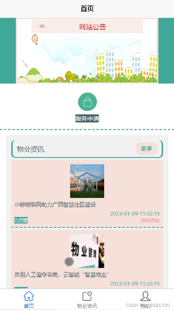 首页,物业资讯,基本信息,收藏,服务申请,服务进度,服务评论等。