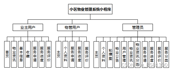 小区物业管理系统小程序的主要使用者分为管理员,业主用户,物管用户,实现功能包括个人资料(个人信息,密码修改),公共管理(轮播图,物业公告)用户管理(管理员,业主用户,物管用户),信息管理(物业资讯,物业资讯分类),服务申请,服务进度,服务评论,服务分类。