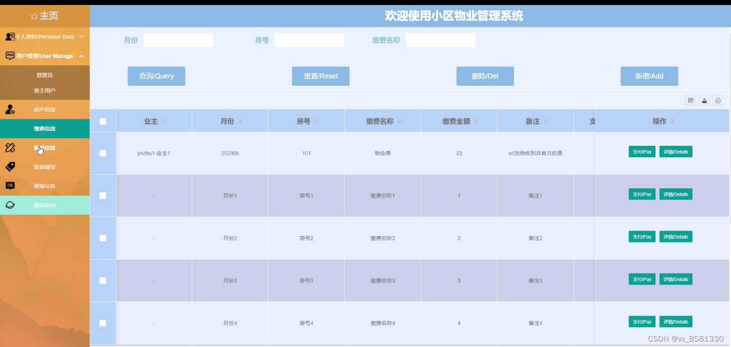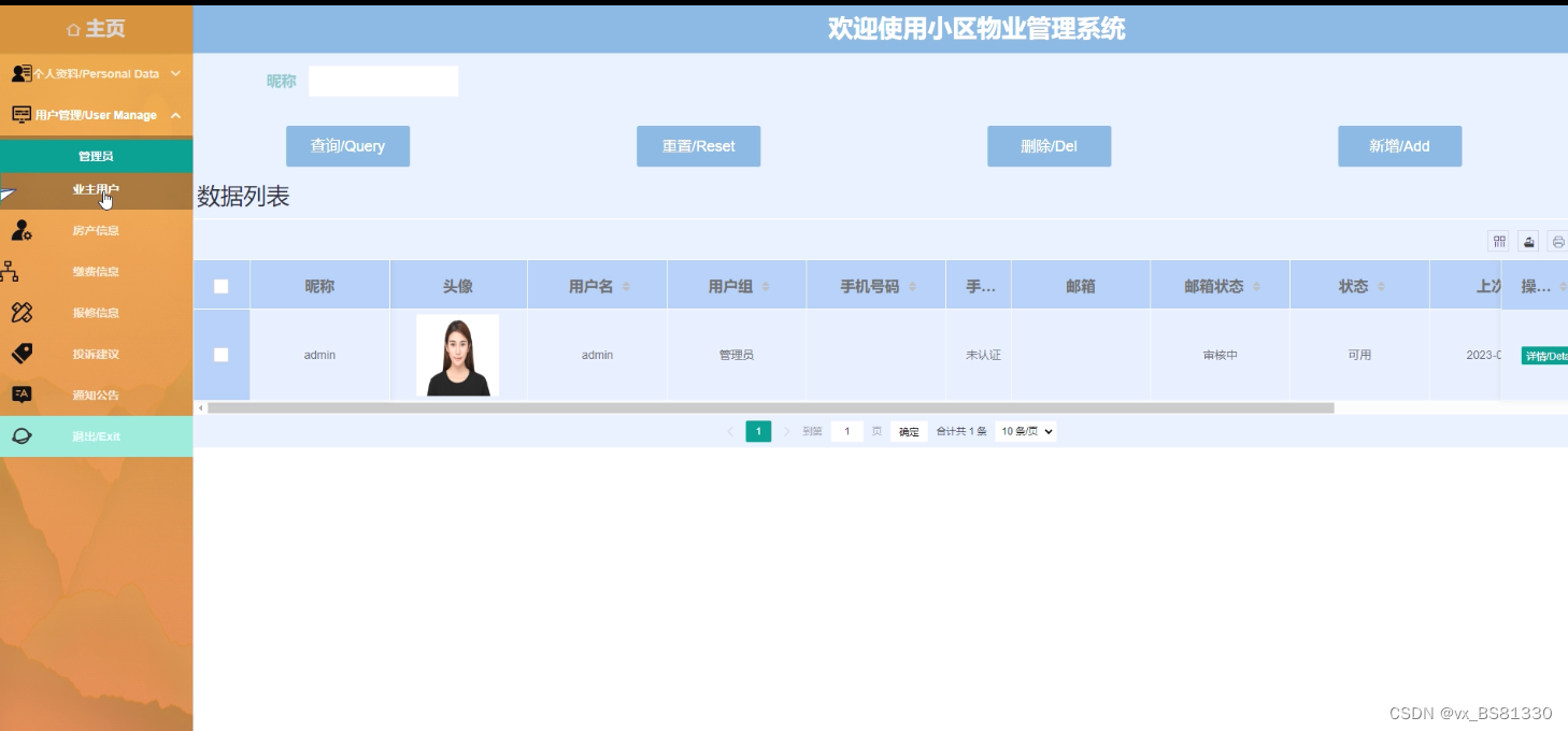 用户管理模块包含了管理员,业主用户两个部分,管理员可以查看到业主的信息,但是只有管理员可以对业主进行增删改查操作,界面如下图4.11所示。