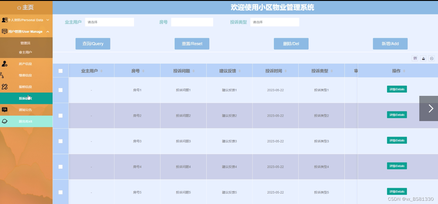 5.管理员功能,管理员可以对用户或者小区物业进行管理。