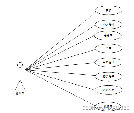 管理员登录后可进行系统首页、个人资料(个人信息。修改密码)、公共管理(轮播图、公告)、用户管理(管理员、系统用户)、信息管理(相关资讯、资讯分类)、数据库管理,管理员用户的用例如图3-1所示。