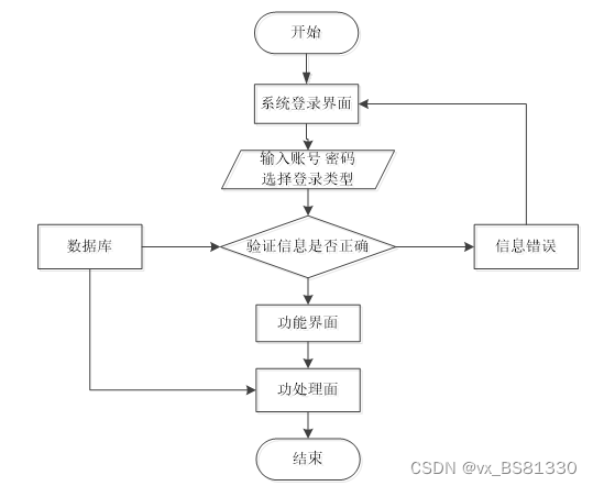 用户想进入系统,首先进入系统登录界面,通过正确的用户名、密码,选择登录类型登录,系统会检查登录信息,信息正确,然后输入相应的功能界面,提示信息错误,登录失败。系统操作流程如图3-3所示。