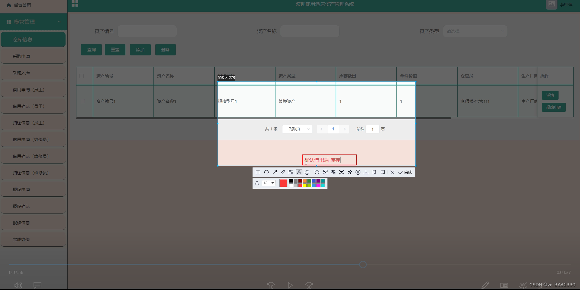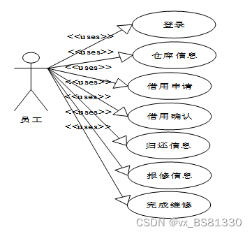 员工登录系统后可以查看仓库信息,可以进行借用申请、借用确认、资产归还以及进行报修申请等。