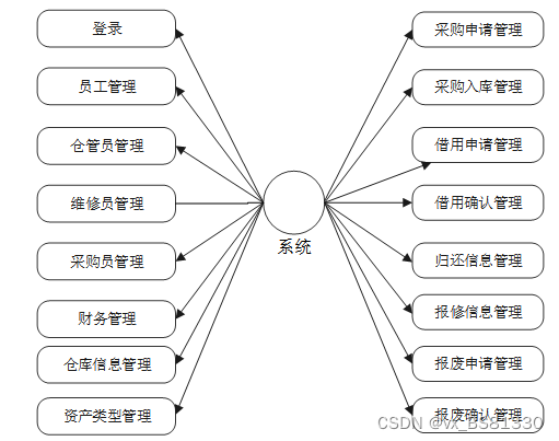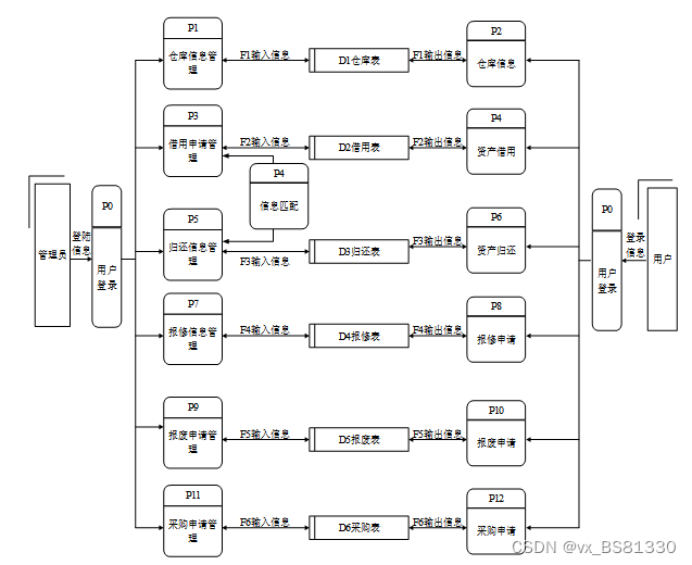 对系统的数据流进行分析,系统的使用者分为二类,系统用户(员工、维修员、采购员、仓管员、财务员),管理员。系统主要对界面信息传送,登录信息的验证,注册信息的接收,用户各种操作的响应做处理。
