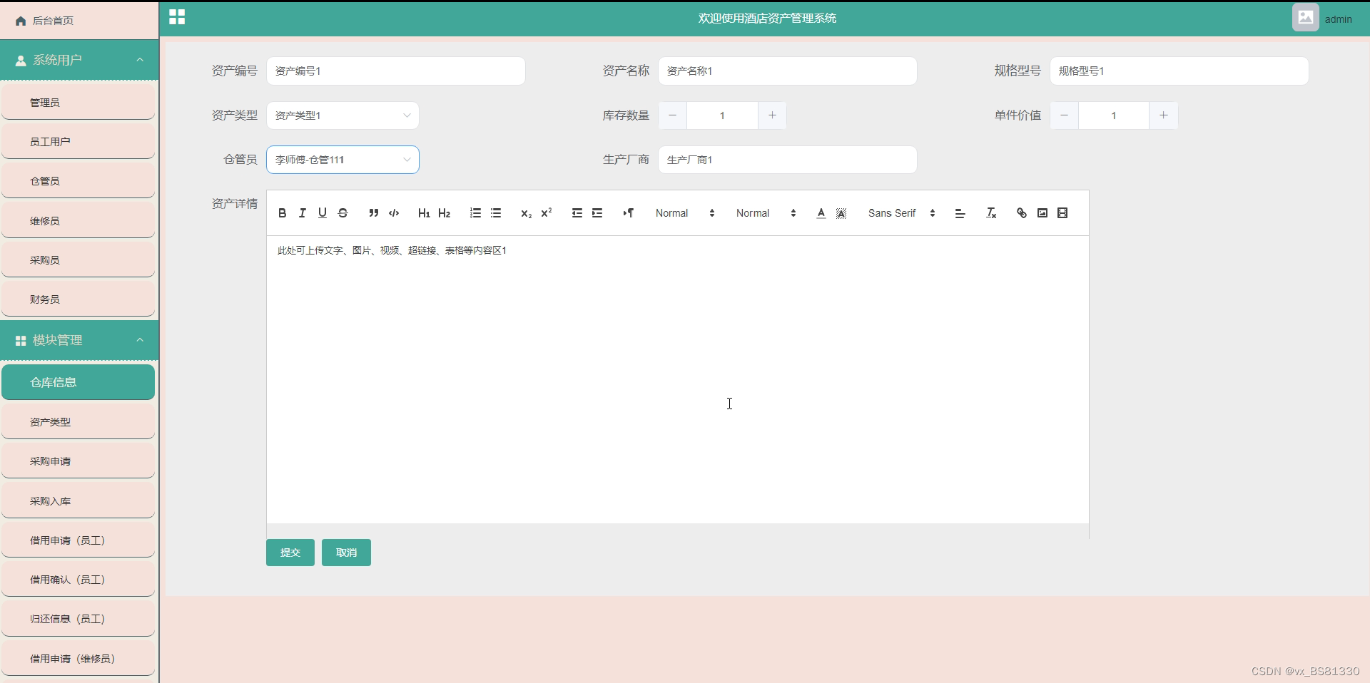 酒店资产管理系统的功能主要分为员工用户、仓管员、维修员、采购员、财务员、管理员等六个角色。