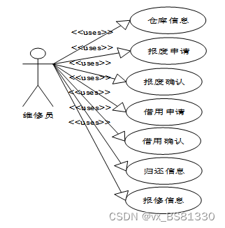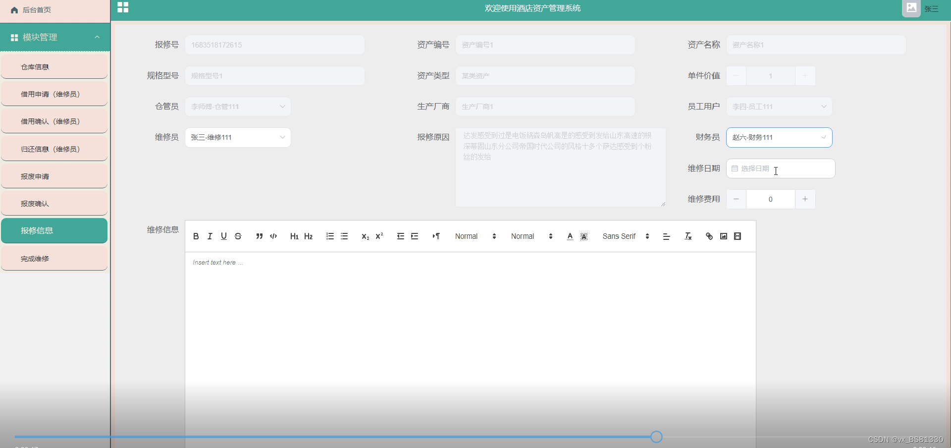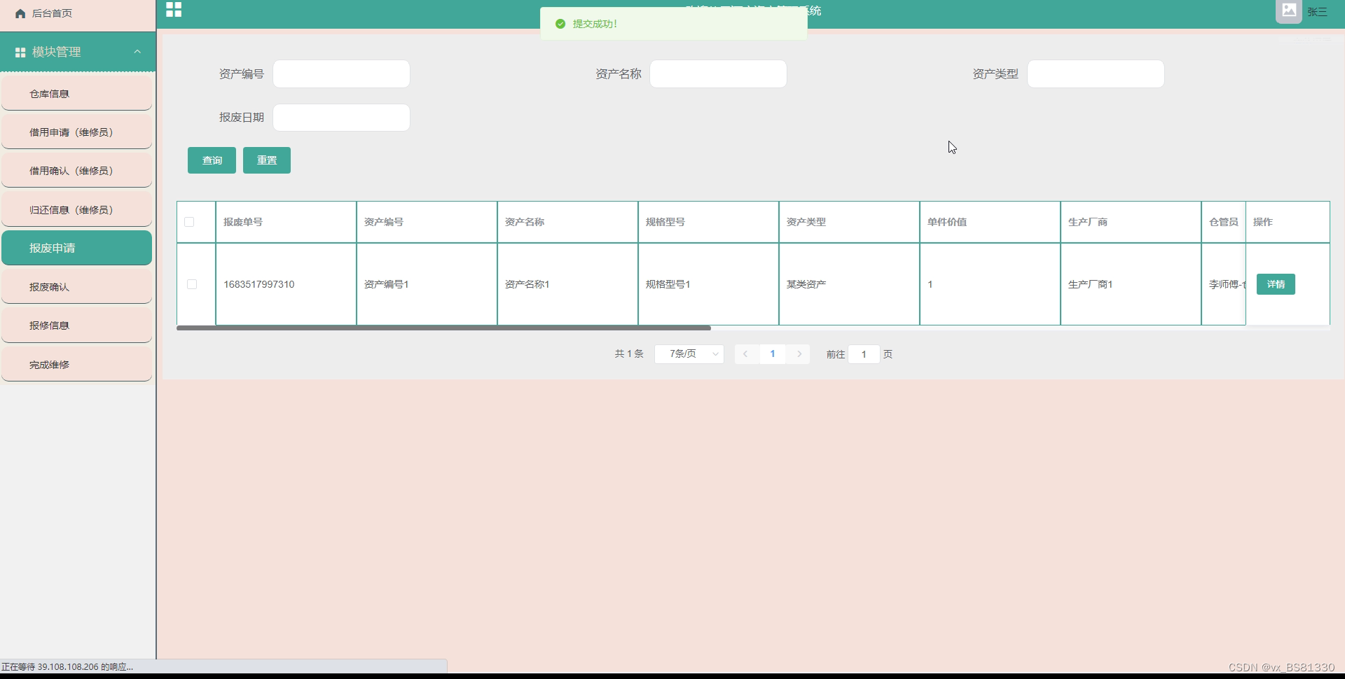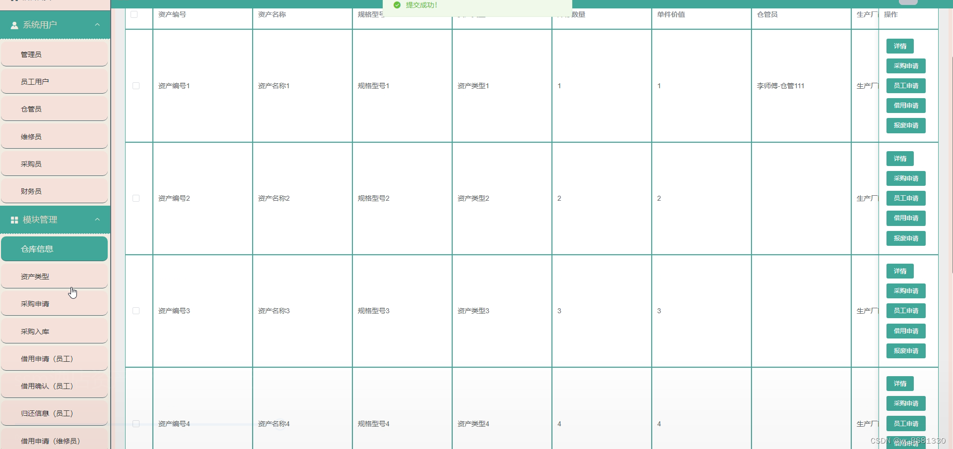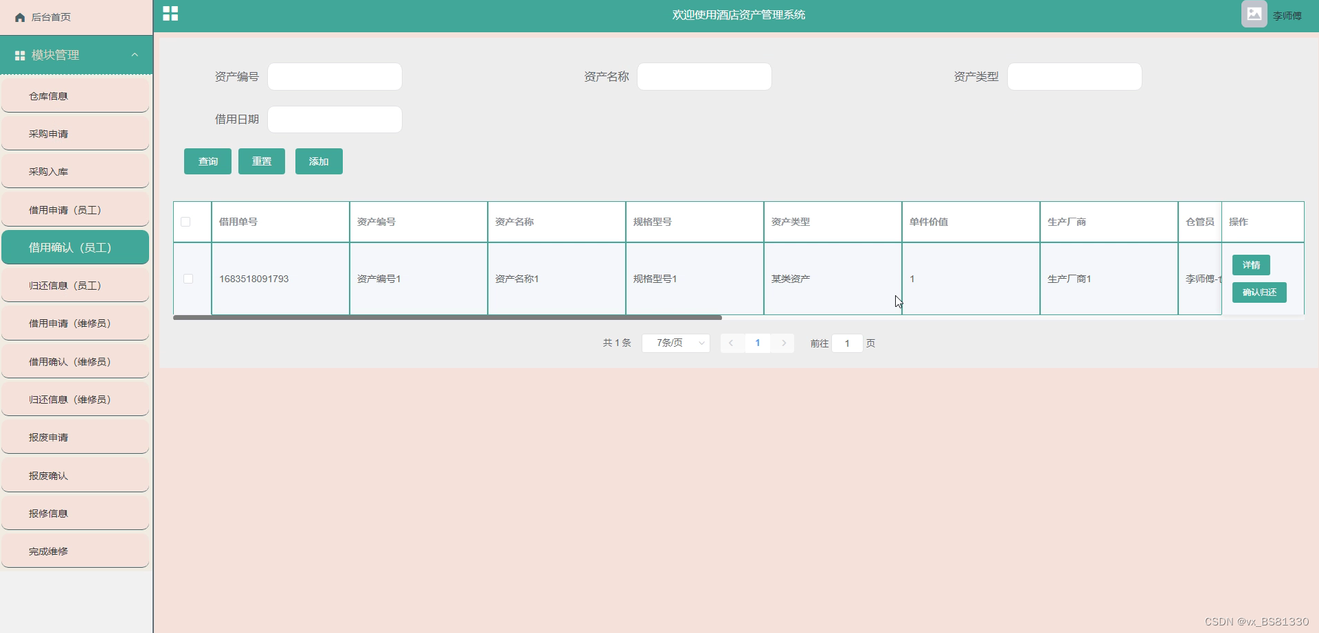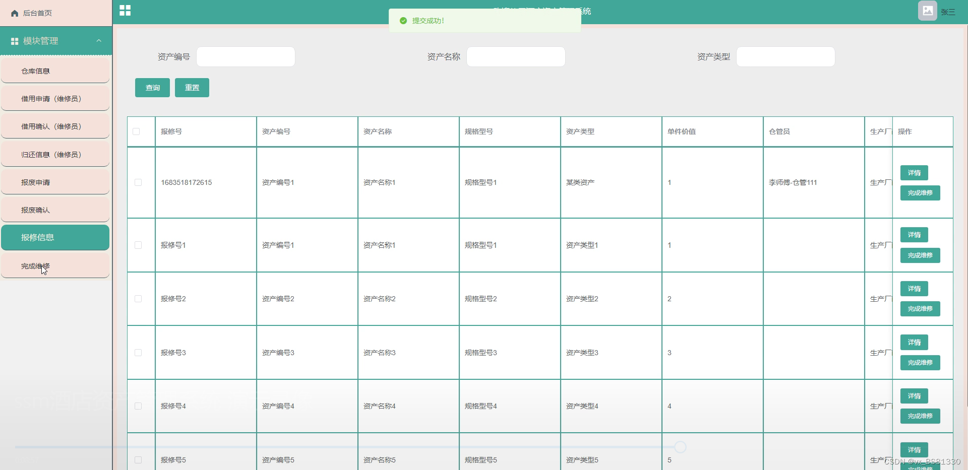 维修员登录系统可以对仓库信息进行查看,可以对仓库里的资产进行借用、归还等,可以查看到员工提交的维修信息。