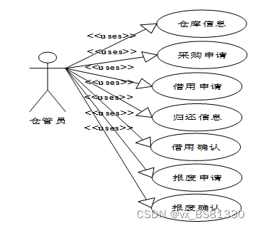 仓管员登录系统后可以对仓库信息进行管理,对采购申请以及采购信息进行查看,对员工的借用申请以及归还信息进行审核处理,对仓库里的资产进行报废申请。
