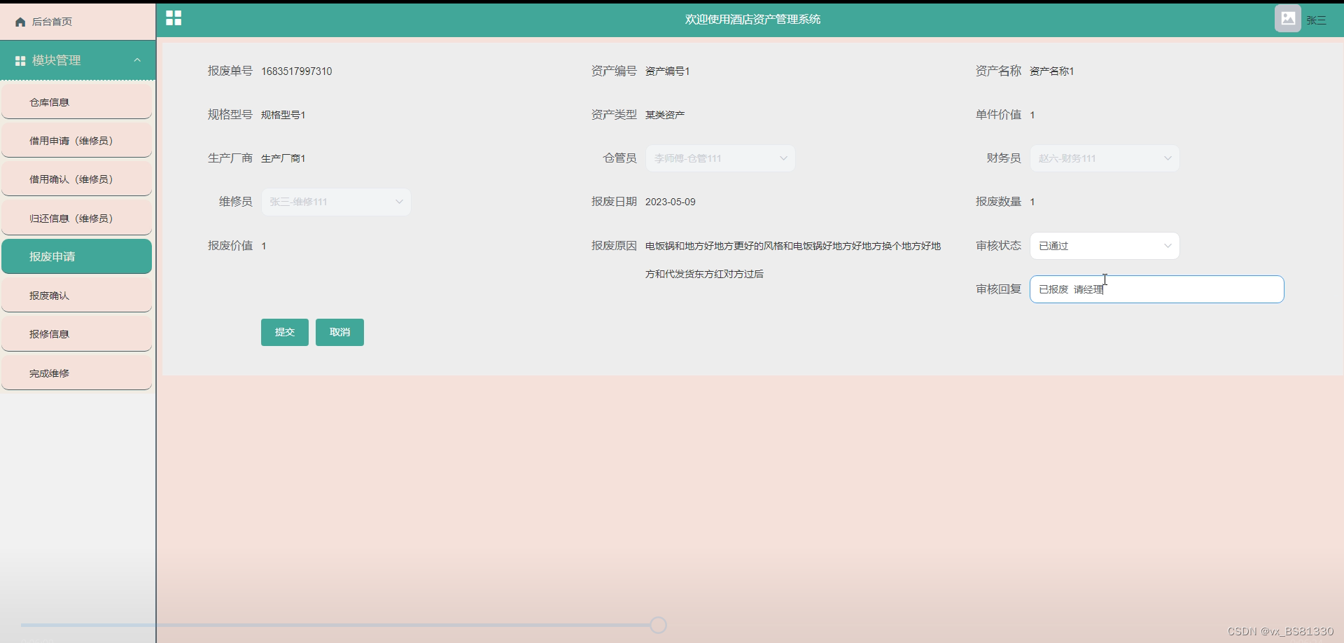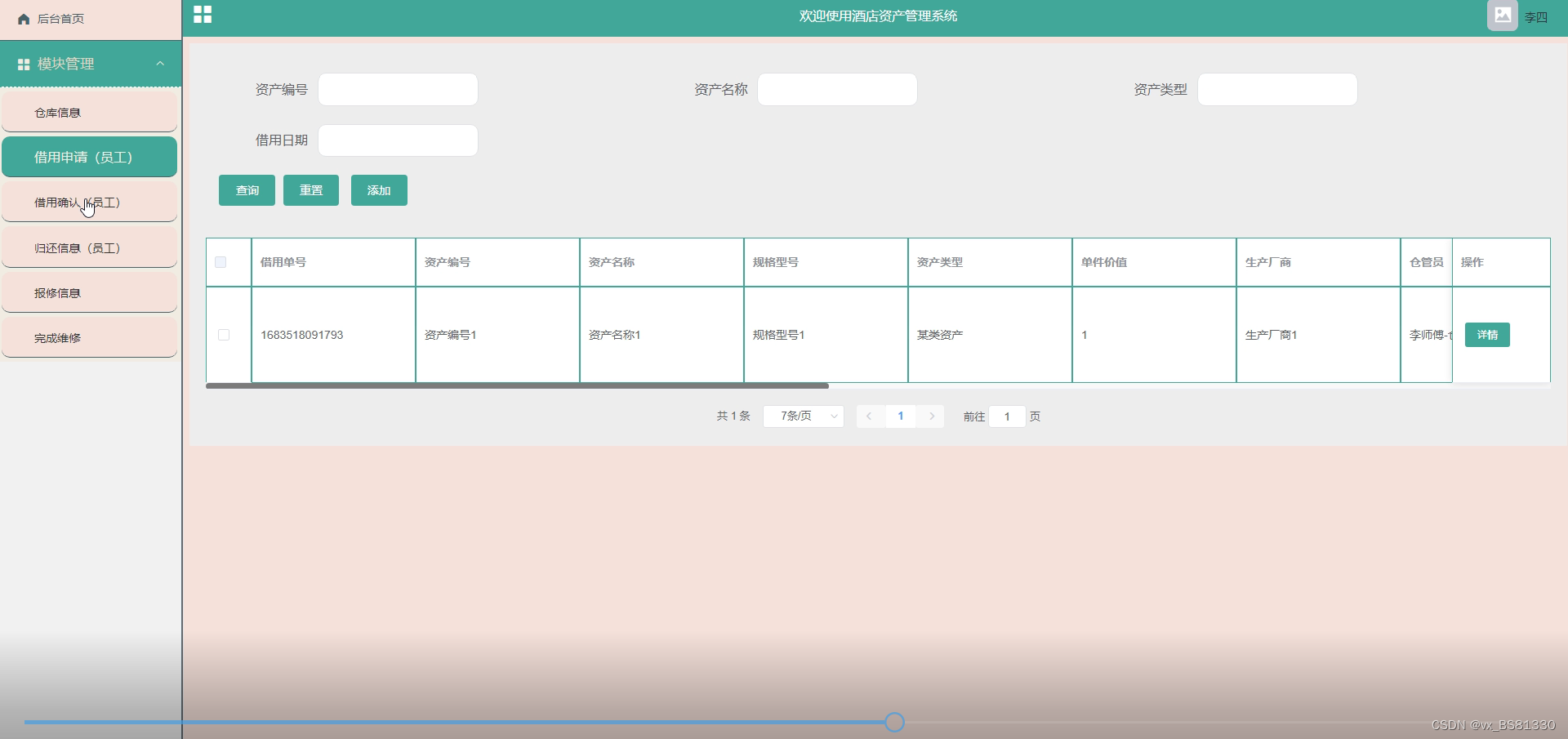 借用申请:此模块分为员工对资产的借用申请以及维修员对资产的借用申请,申请单统一由仓管员进行审核。