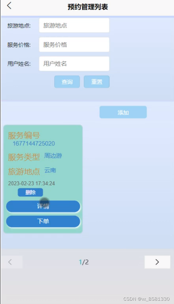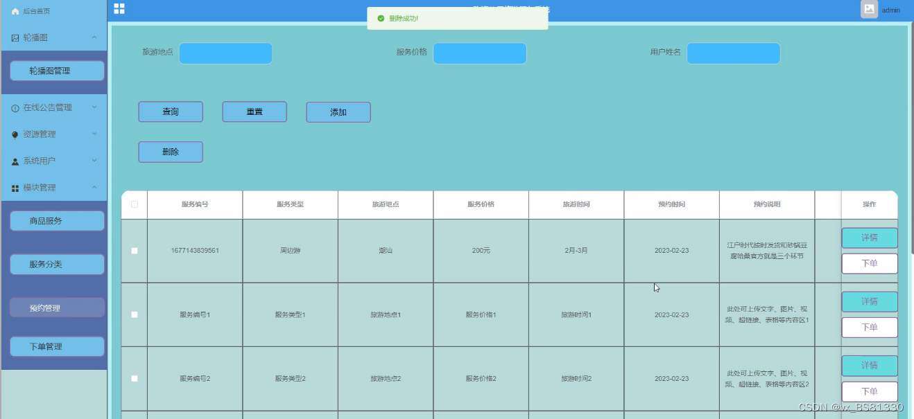 预约管理,在预约管理页面可以查看服务编号、服务价格、预约说明、服务类型、旅游时间、旅游地点、预约时间、用户姓名、用户账户、联系方式等内容,并可根据需要进行下单、添加、修改或删除操作,如图5-12所示。