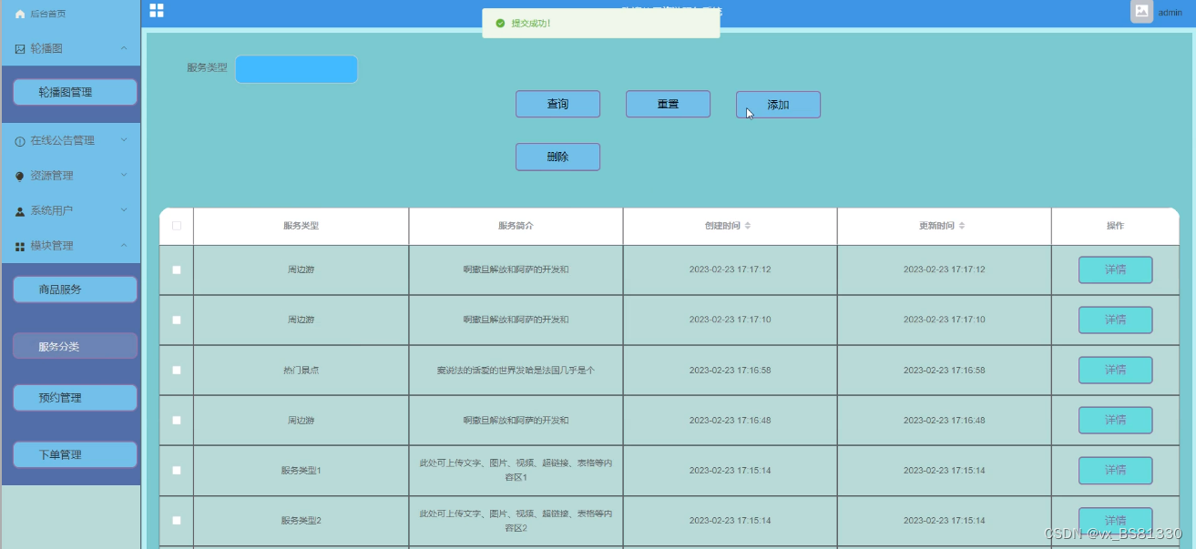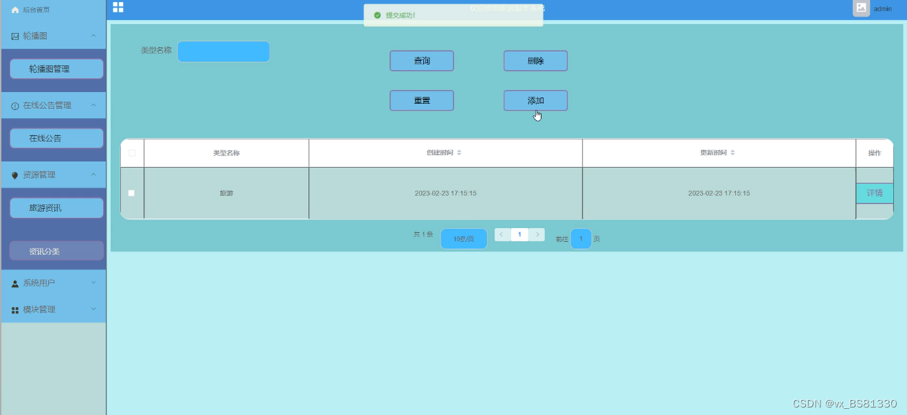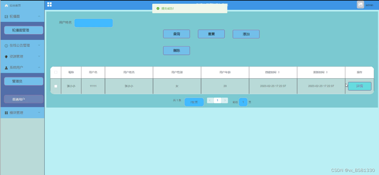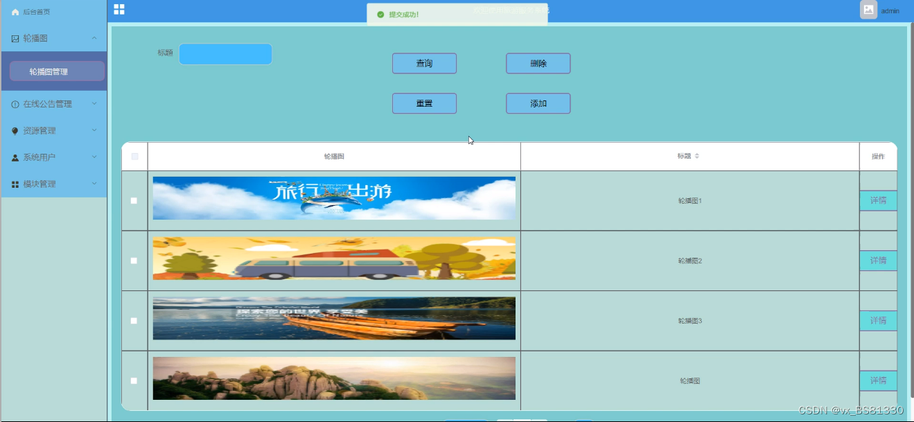 轮播图管理,管理员通过输入标题、轮播图等内容,根据详情进行添加、查询、删除等操作提交,如图5-8所示。