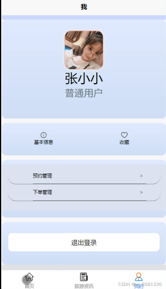 首页,可以进行首页、旅游资讯、我的(预约管理、下单管理、个人中心、收藏)等功能模块的查看与操作,如图5-3所示。