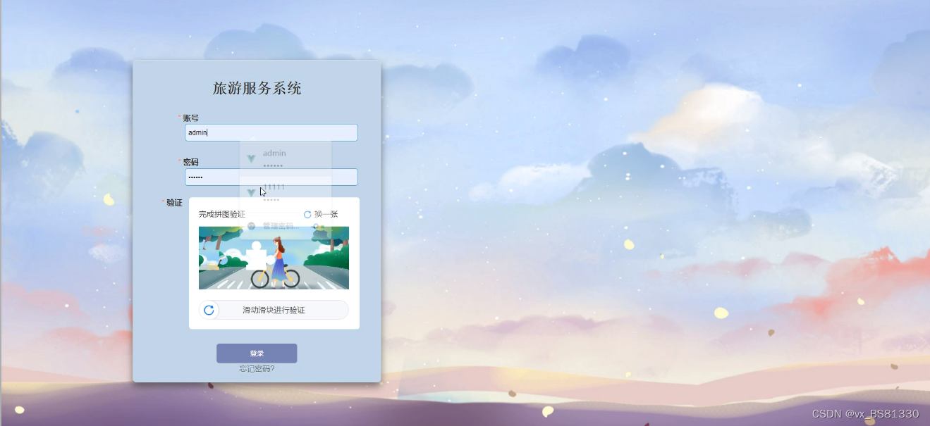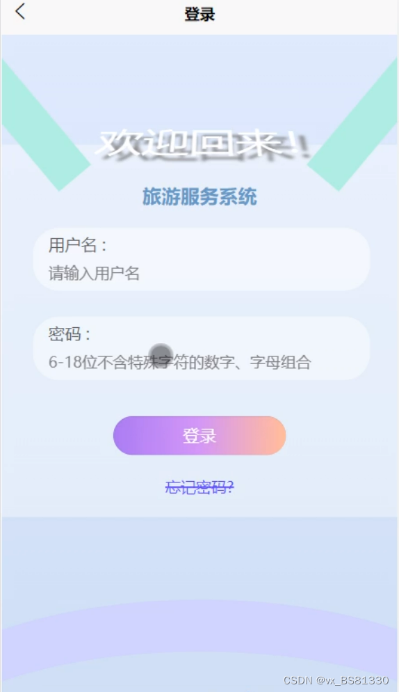 旅游服务系统小程序管理系统登录界面,通过填写账号、密码、等信息进行登录,如图5-1所示。