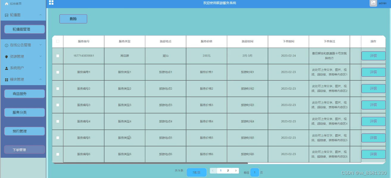 预约管理列表,在预约管理列表页面可以查看旅游地点、服务价格、用户姓名、服务编号、服务类型、下单时间、下单备注、联系方式等操作,如图5-6所示。