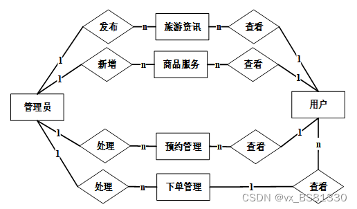 (3)确定好系统使用的技术,进行在线确认系统所划分的用户角色,并且根据用户角色划分确定所要设计的功能模块,对于旅游服务系统小程序管理系统系统的设计主要划分别为管理员和用户角色,并所使用的功能模块也相应不同,但是系统的数据库实现的内容是交互的,用户可以随时根据自己的需求进行课程信息,对于系统工作人员可以根据自己的分管内容进行在线信息的处理及操作,管理员获取到所有用户的详细数据信息,并根据需求进行第一时间处理解决。