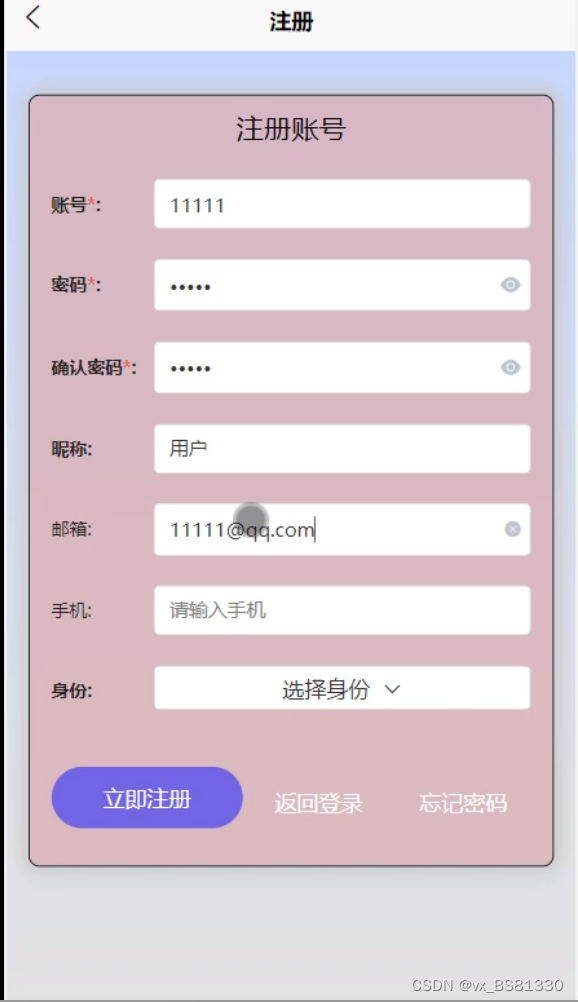 注册,通过填写账号、密码、确认密码、昵称、手机、身份、邮箱、用户姓名、用户性别、用户年龄等信息,输入完成后选择提交即可注册成功,如图5-2所示。
