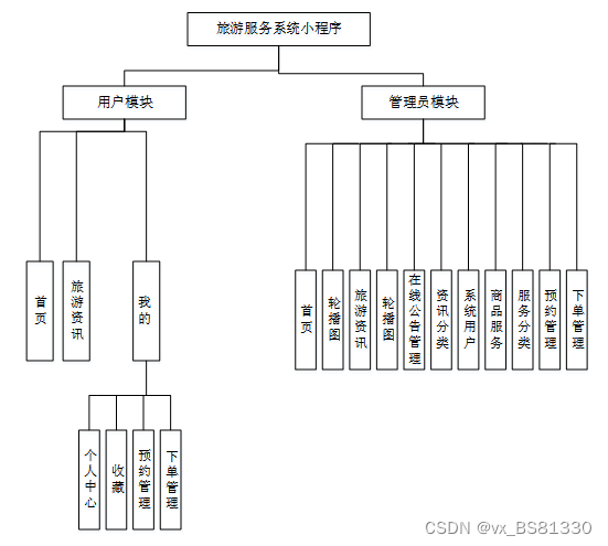 旅游服务系统小程序管理系统基于现有的手机,可以实现管理员:首页、轮播图(轮播图管理)、在线公告管理(在线公告)、资源管理(旅游资讯、资讯分类)、系统用户(管理员、普通用户)、模块管理(商品服务、服务分类、预约管理、下单管理)等详细的了解及统计分析。根据系统功能需求建立的模块关系图如下图: