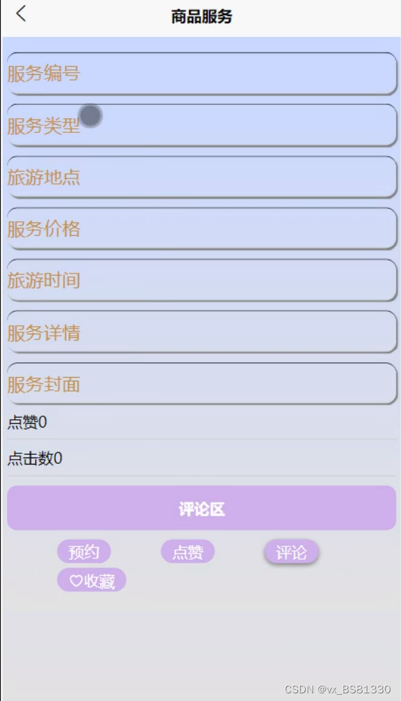 商品服务页面可以查看展示的服务编号、服务类型、旅游地点、服务价格、旅游时间、服务详情、服务封面、等信息,并可通过关键词搜索商品服务,并对商品服务点赞、评论、预约、收藏等操作。如图5-4所示。