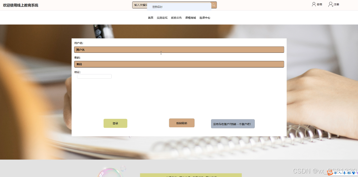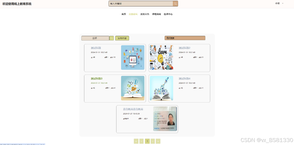 (2)查看线上教育系统的首页信息:线上教育系统的首页、交流论坛、系统公告、课程商城、选课中心、我的账户、个人中心等。