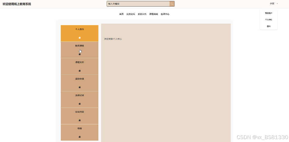 (8)个人中心:当学生用户点击右上角“个人中心”这个按钮,就会进入到对应的后台进行信息的管理了。用户在前台点击“个人中心”可以对个人首页、购买课程、课程文件、退款申请、选课记录、论坛列表和自己收藏的信息进行管理。