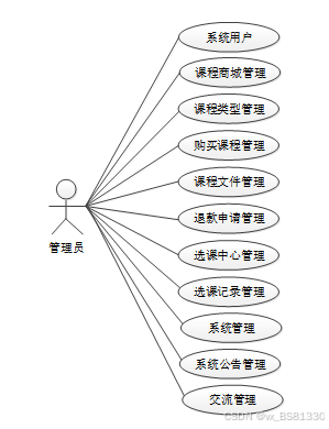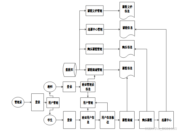 (3)确定好系统使用的技术,进行确认系统所划分的用户触,并且根据用户触划分确定所要设计的功能模块,对线上教育系统的设计主要划分别为管理员和用户,并且所使用的功能模块也相应不同,但系统的数据库实现的内容是交互的,用户可以随时根据自己的需求进行课程商城信息搜索,对于系统工作人员可以根据自己的分管内容进行在线信息的处理及操作,管理员获取到所有用户的详细数据信息,并根据需求进行第一时间处理解决。