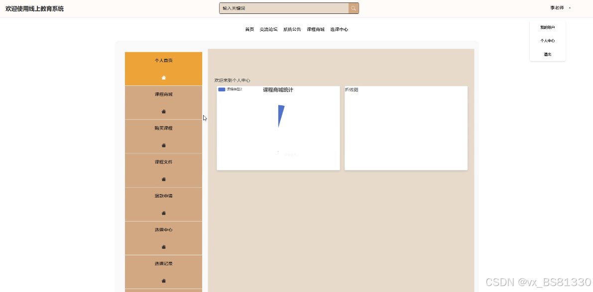 (4)个人中心:当教师用户点击右上角“个人中心”这个按钮,就会进入到对应的后台进行信息的管理了。教师用户在前台点击“个人中心”可以对个人首页、课程商城、购买课程、课程文件、退款申请、选课中心、选课记录、论坛列表和自己收藏的信息进行管理。