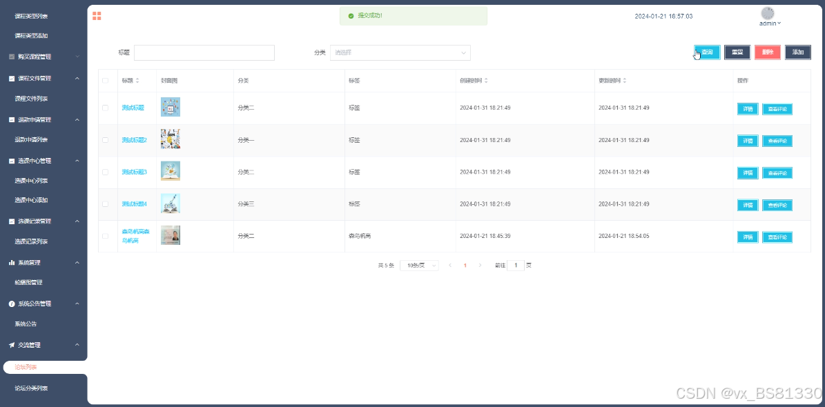 (12)交流管理:管理员可以对线上教育系统前台展示的交流论坛以及交流论坛所属的分类进行管控。