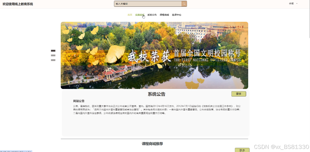 This design mainly implements an online education system that combines the advantages of humanization, high efficiency, and convenience. The functions include the system homepage, communication forum, system announcement, course mall, course selection center, personal center, and other functional modules. The system communicates with the server through a browser to achieve data exchange and change. You only need to use a computer and move your fingers to operate the system, achieving data communication management. The entire system design process fully considers issues such as data security, stability, and reliability, and the operation process is simple. This system improves work efficiency and reduces errors and omissions in data storage through scientific management and convenient services.