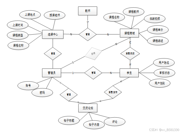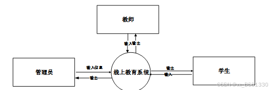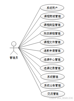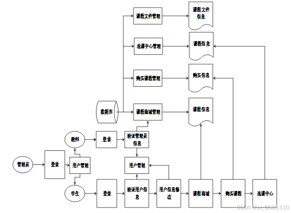 (3)确定好系统使用的技术,进行确认系统所划分的用户触,并且根据用户触划分确定所要设计的功能模块,对线上教育系统的设计主要划分别为管理员和用户,并且所使用的功能模块也相应不同,但系统的数据库实现的内容是交互的,用户可以随时根据自己的需求进行课程商城信息搜索,对于系统工作人员可以根据自己的分管内容进行在线信息的处理及操作,管理员获取到所有用户的详细数据信息,并根据需求进行第一时间处理解决。