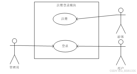 (1)注册登录模块:注册是游客独有的功能,注册后就成了系统的正式用户了,然后正式用户通过前台登录,管理员用户通过后台登录。注册登录模块用例如下图2-1所示。