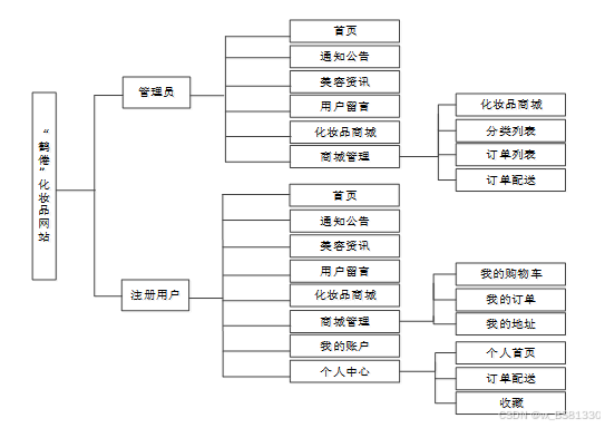 本PHP“鹤倦”化妆品网站的设计主要是针对三种用户进行使用,第一种是以游客身份使用,游客在进入系统后可以查看到系统中的所有内容,包括首页、通知公告、美容资讯、用户留言、化妆品商城,如果想要留言评论、购买或者进行商城管理,可以注册登录;第二种是注册之后有账号的用户,登录以后导航栏会增加一个商城管理模块,可以留言、收藏、评论、购买、管理收货地址、订单、个人资料等;第三种则是管理员,是系统的管理者,管理员对系统中的美容资讯、化妆品商城、用户提交的留言信息、订单等信息进行整体把控。