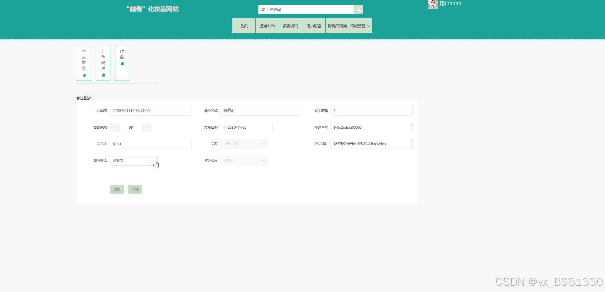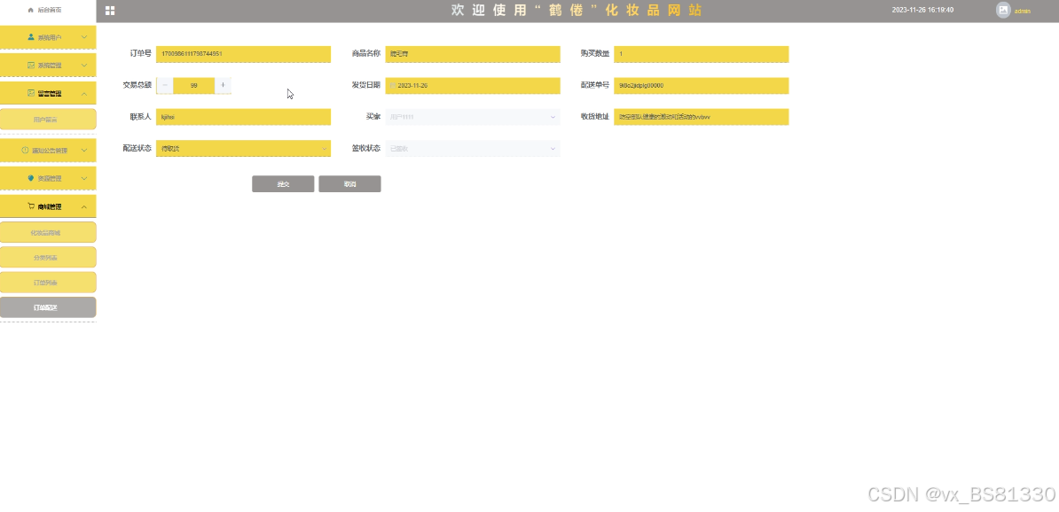 管理员拥有对所有订单的进行配送操作。可以对订单配送信息进行维护更新。订单配送信息更新界面如下图4-19所示。