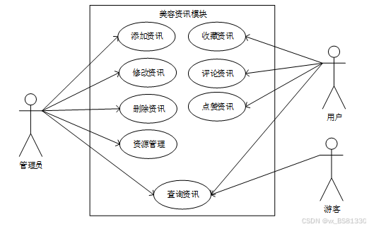 (3)美容资讯模块:游客可以查看美容资讯,用户可以收藏、评论、点赞美容资讯信息,管理员可以添加、修改、删除美容资讯,管理资讯评论。美容资讯模块用例如下图2-3所示。