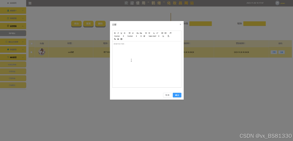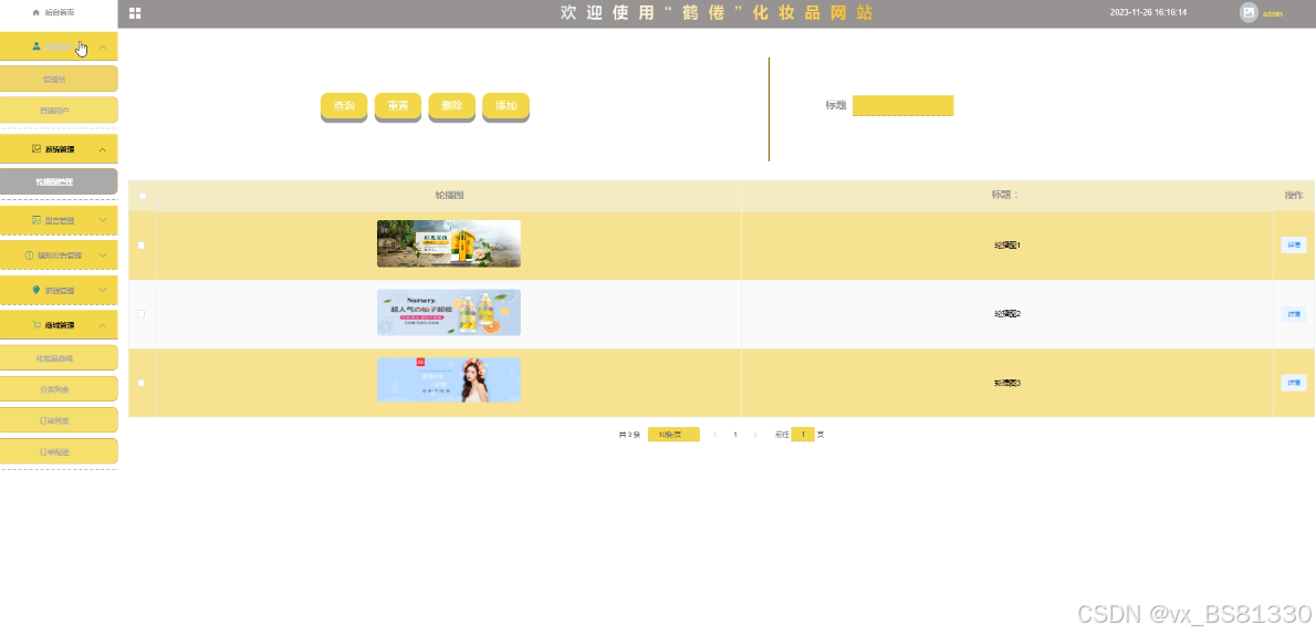 “鹤倦”化妆品网站中的管理人员在“系统管理”这一菜单下是可以对“鹤倦”化妆品网站内展示的轮播图进行添加修改的。系统管理界面如下图4-13所示。