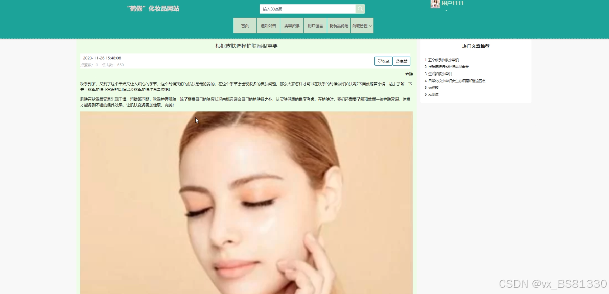 当用户点击“鹤倦”化妆品网站平台中导航栏上的“美容资讯”后将会进入到该“美容资讯”列表的界面,然后选择想要看的资讯信息,点击进入到详细界面,在详细界面可以收藏+赞+评论等操作。美容资讯详情界面如下图4-6所示。