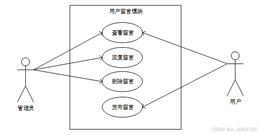 (2)用户留言模块:用户留言是前台用户进行留言内容提交,后台管理员对留言内容进行回复,增删改查。用户留言模块用例如下图2-2所示。