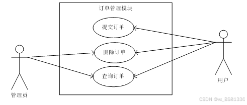 (7)订单管理模块:订单管理模块是前台用户和后台管理员都有的功能,前台用户可以提交订单,管理订单,管理员能够对用户订单进行管控。订单管理模块用例如下图2-7所示。