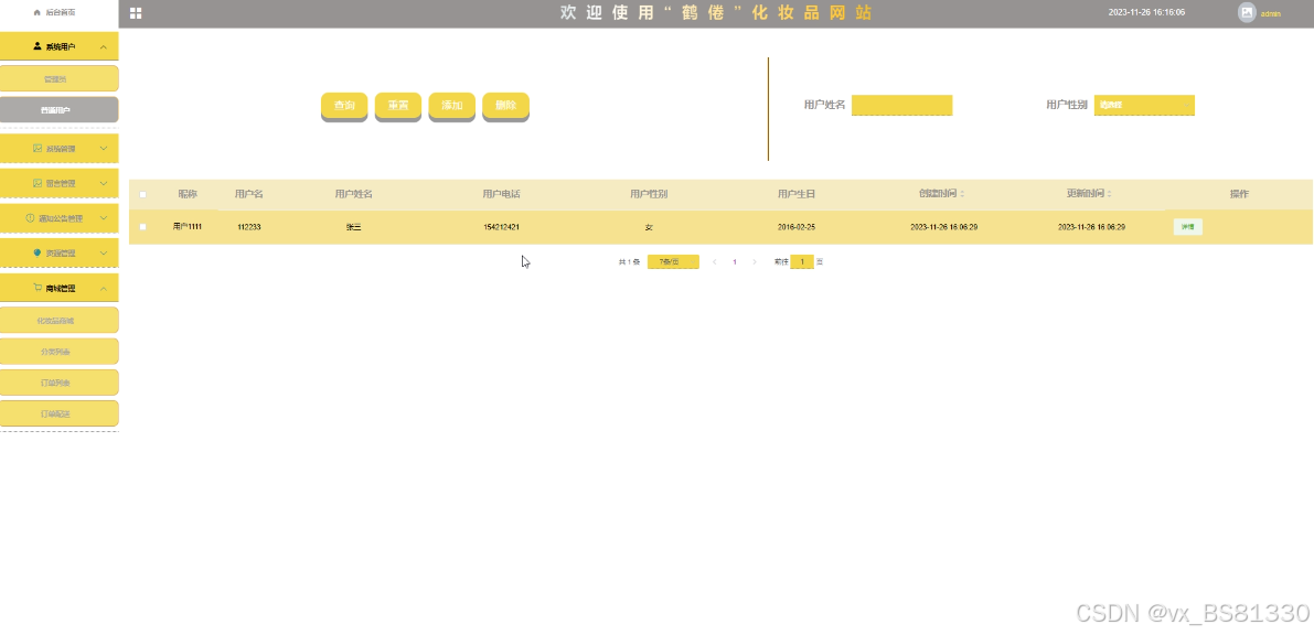 在后台系统用户管理中,主要是管理注册的普通用户和管理员用户,管理员拥有对所有用户管控的功能。系统用户界面如下图4-12所示。