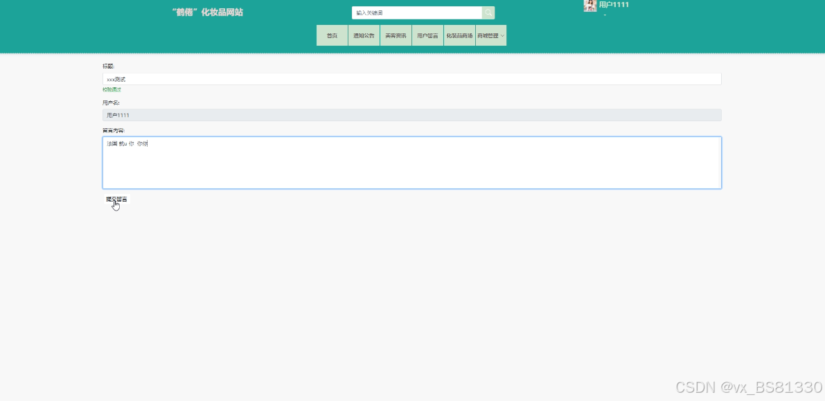 点击导航栏上的“用户留言”,可以填写标题、用户名、留言内容,然后点击“提交”按钮进行提交用户留言,用户留言界面如下图4-7所示。
