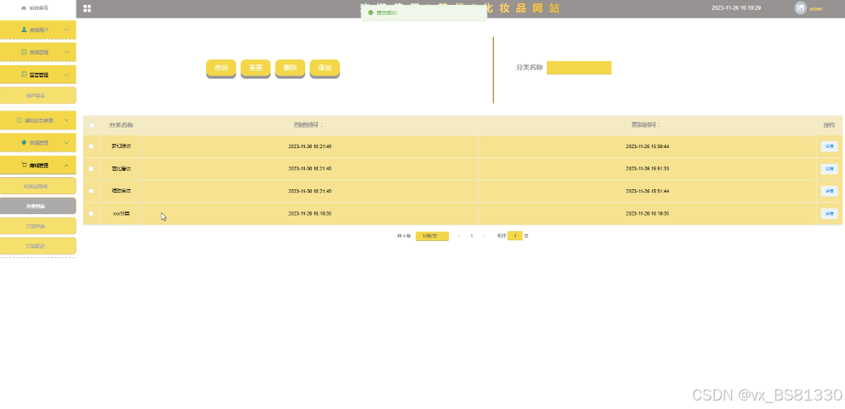 管理员拥有对商品的分类增删改查的功能,分类列表界面如下图4-17所示。