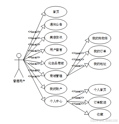 “鹤倦”化妆品网站的完整UML用例图分别是图2-1和图2-2,在参与者上包括普通用户以及管理员。