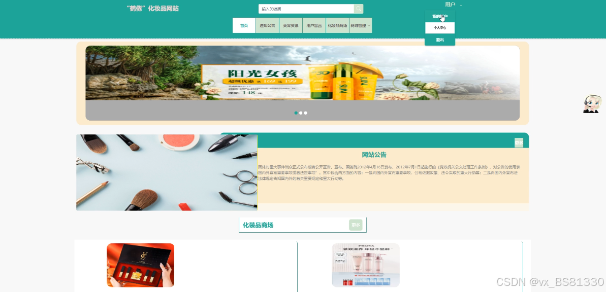 在系统前台中主要实现的是对“鹤倦”化妆品网站中信息的浏览,用户对信息收藏、评论以及在化妆品商城中对商品购买几个功能。