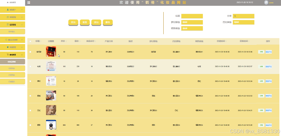 管理员拥有对化妆品商城中的商品进行添加、修改、删除、管理评论的功能,化妆品商城管理界面如下图4-16所示。