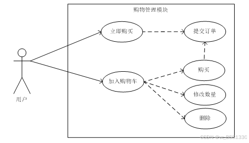(6)购物管理模块:购物管理是前台用户独有功能,用户可以选择两种购买方式,一种是把商品加入到购物车,另一种是直接购买,最终实现购物功能,购物管理模块用例如下图2-6所示。