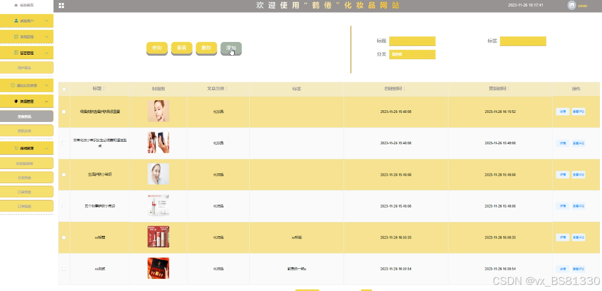 管理员拥有对前台美容资讯以及资讯分类管理的功能,美容资讯管理的界面如下图4-15所示。