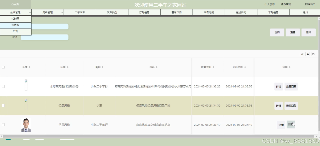 (2)公共管理:管理员点击“公共管理”菜单可以对首页展示的轮播图、留言板和广告信息进行管理。