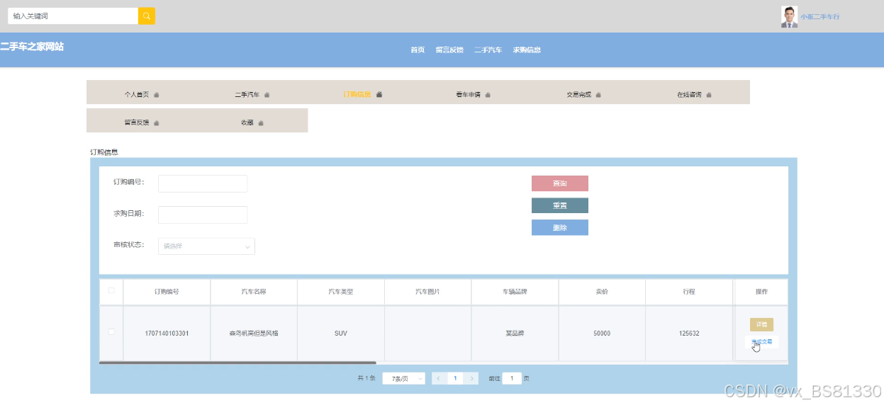 (7)个人中心:用户点击右上角的“用户名”,然后点击“个人中心”可查看个人首页、订购信息、看车申请、交易完成、在线咨询、求购信息、留言反馈和自己收藏的信息并对其进行管理。