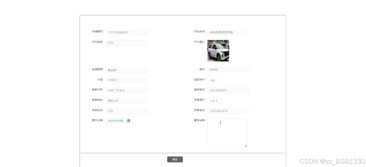 (7)看车申请:管理员点击“看车申请”会显示出系统所有用户的看车申请信息,支持对其进行审核,增删改查。