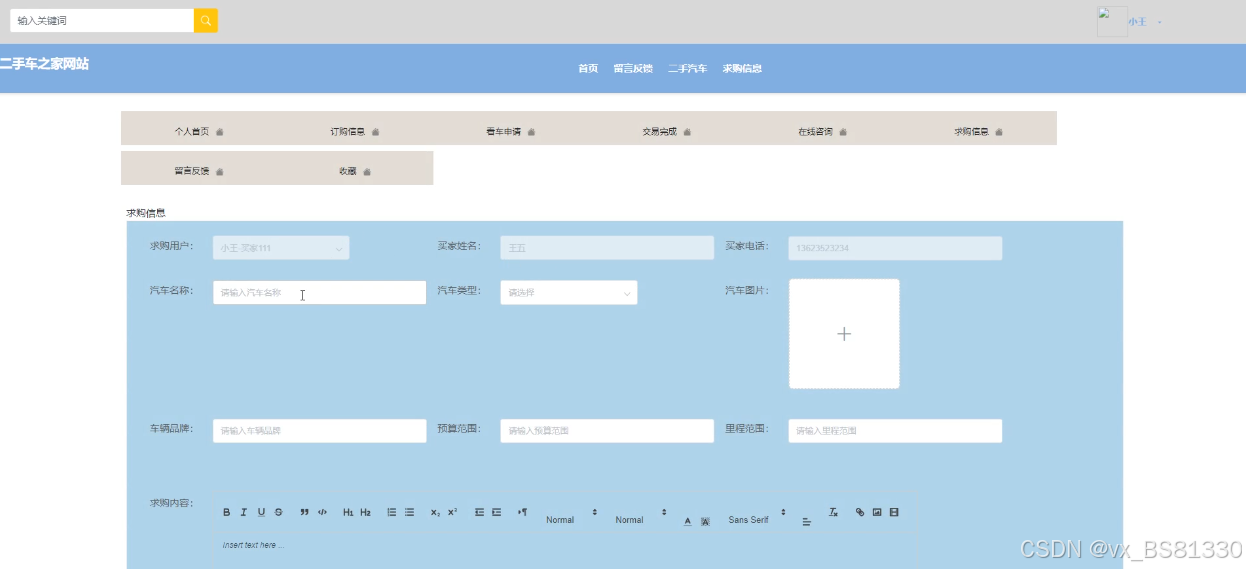 (5)求购信息:用户可以查看求购信息,在查询到自己想要了解的求购信息的时候,可以进入查看详细的介绍包括求购用户、买家姓名、买家电话、汽车名称、汽车类型、车辆品牌、预算范围、里程范围、求购内容等信息。在详情这个界面,同时支持用户对求购信息进行收藏和评论的功能。