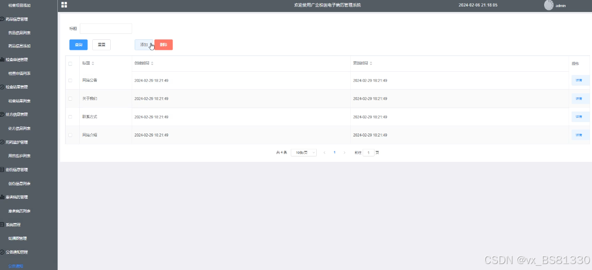 (6)检查项目管理:管理员点击“检查项目管理”会显示出所有的检查项目信息,支持增删改查。