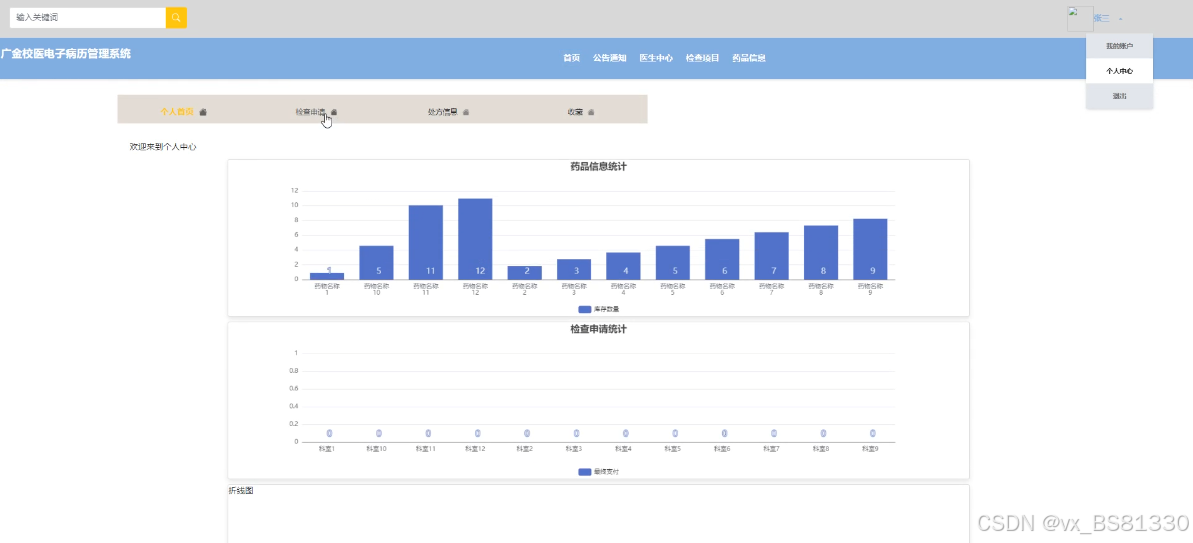 (3)个人中心:财务用户点击右上角的“用户名”,然后点击“个人中心”可查看个人首页、检查申请、处方信息和自己收藏的信息并对其进行管理。
